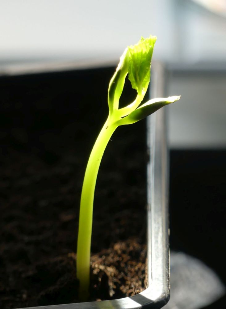Im März zeigt die erste Bittergurke Keimblätter.